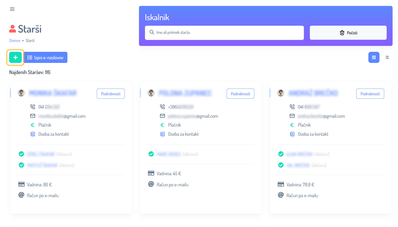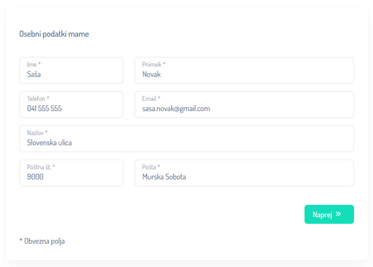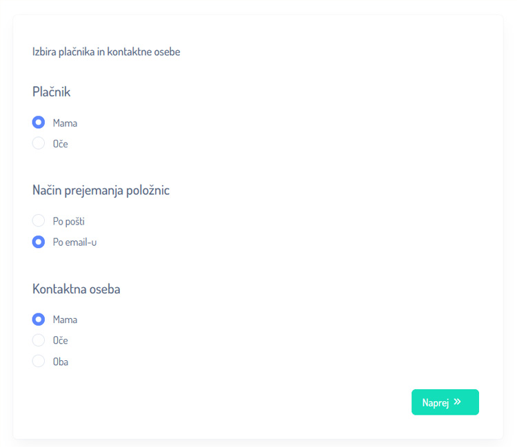 - Vnesite podatke o staršu in potrdite z gumbom naprej.