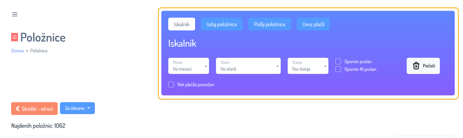 - Filtriranje po plačano/neplačano