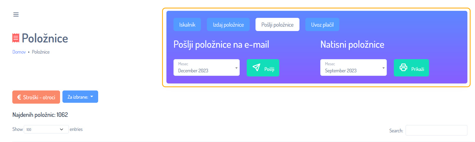 - Pošlji položnice za izbrani mesec. Ob zaključku uporabi gumb Pošlji